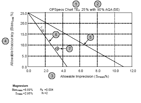 The lowest line on the chart describes the limits of bias and imprecision for the suggested QC procedure with the selected quality control procedure. The line is labeled with the suggested QC rules (13s in the example). The Operating Point should be below this line.